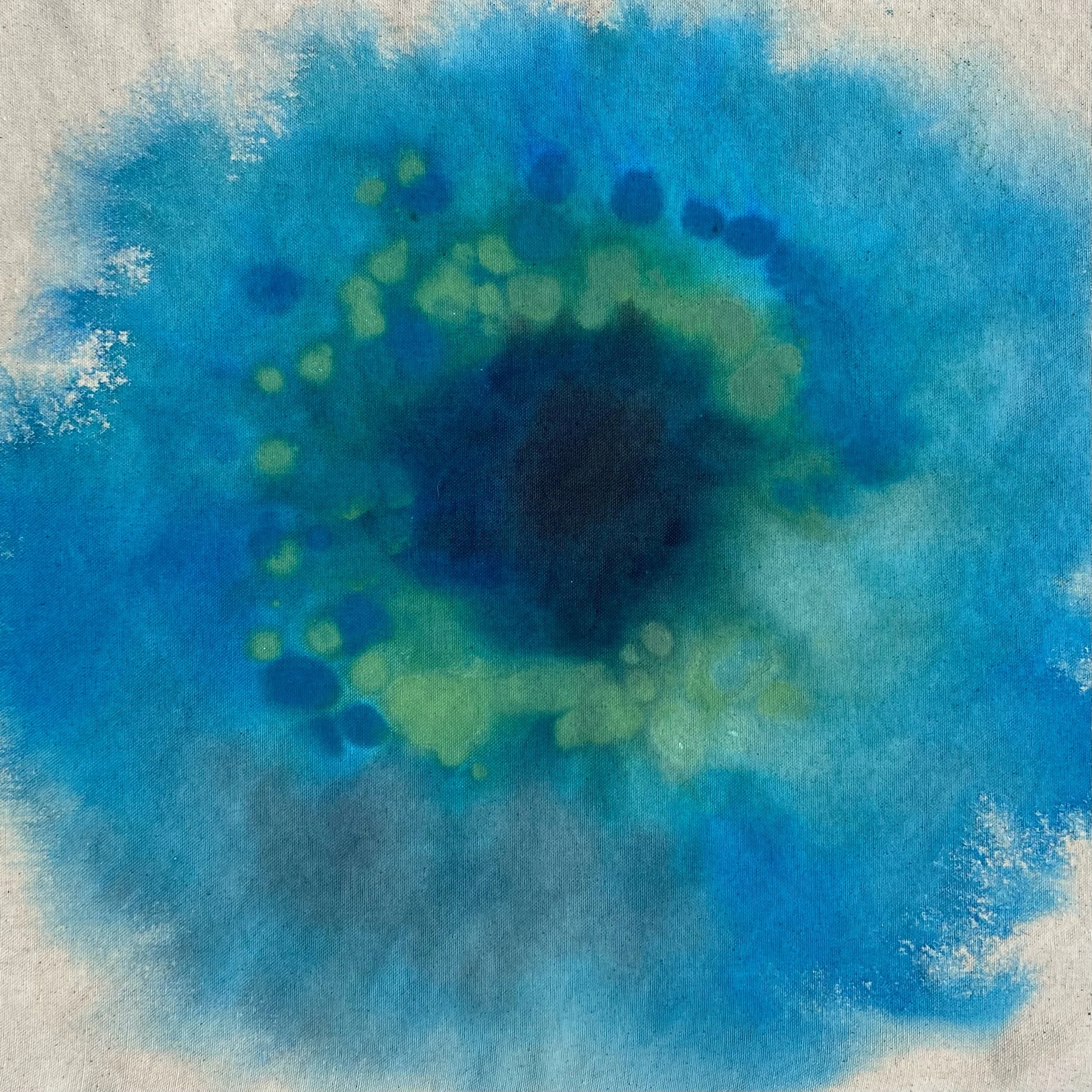 An acrylic on raw canvas painting, inspired by the transcednetal energies of Neptune in Pisces. The colours render where the mists of the imagination meet the ocean dreams